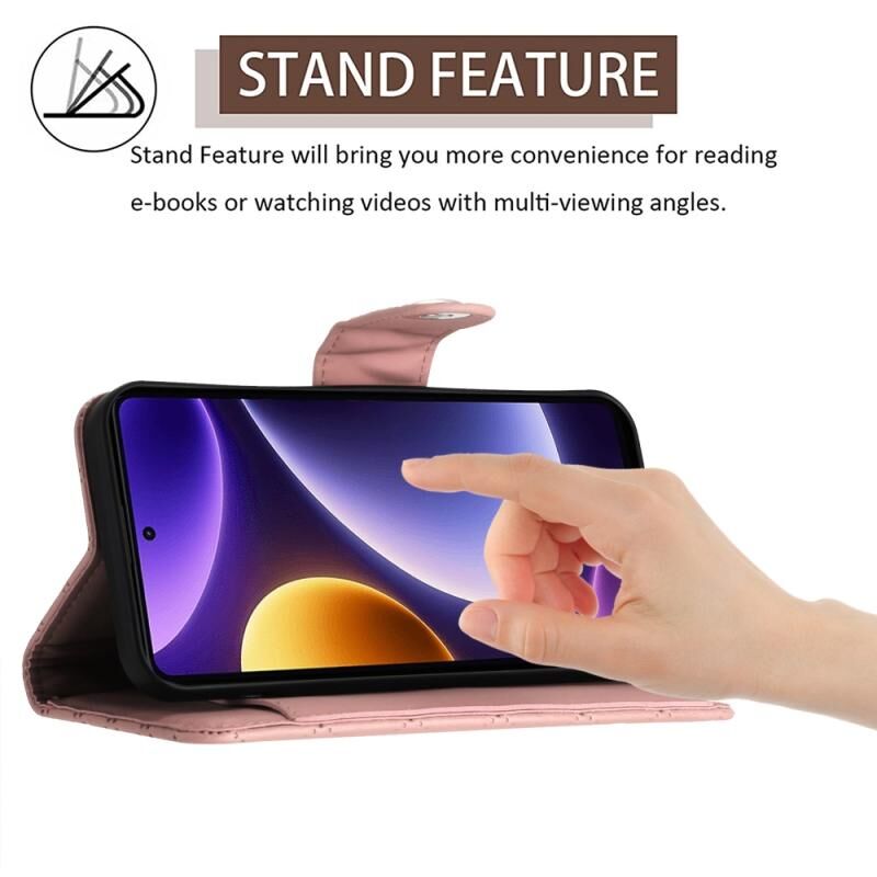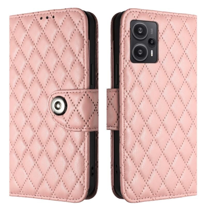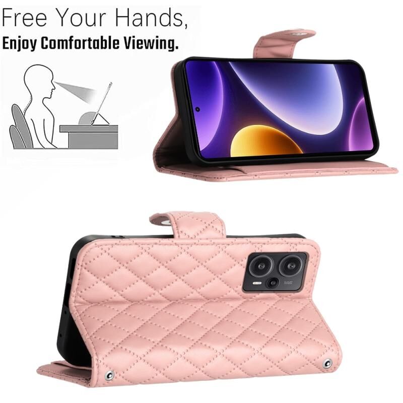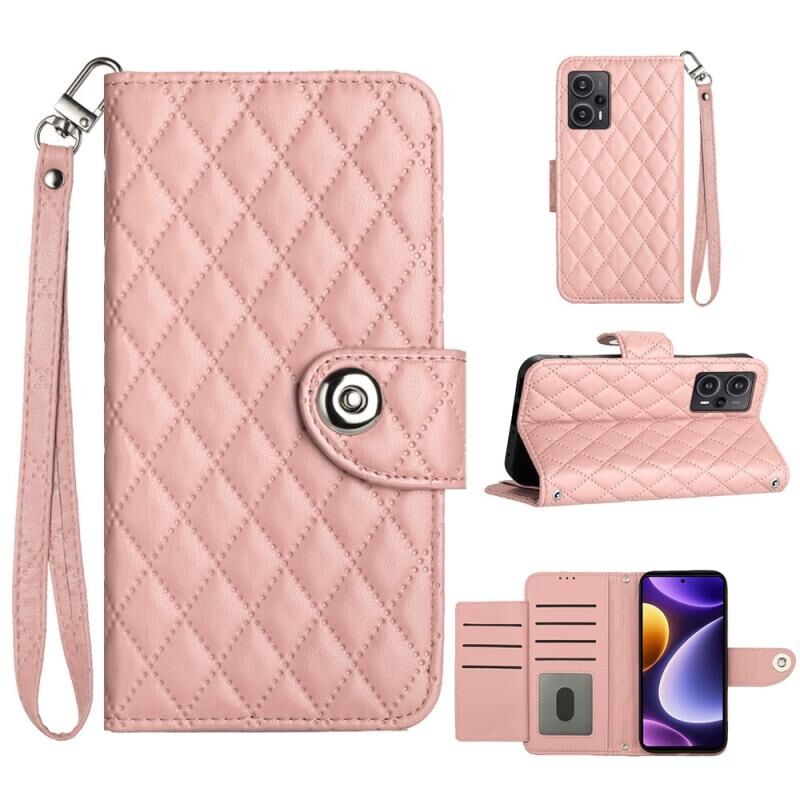 Για Xiaomi Poco F5 / Redmi Note 12 Turbo Rhombic υφή Flip δερμάτινη θήκη τηλεφώνου με κορδόνι (Coral Pink)