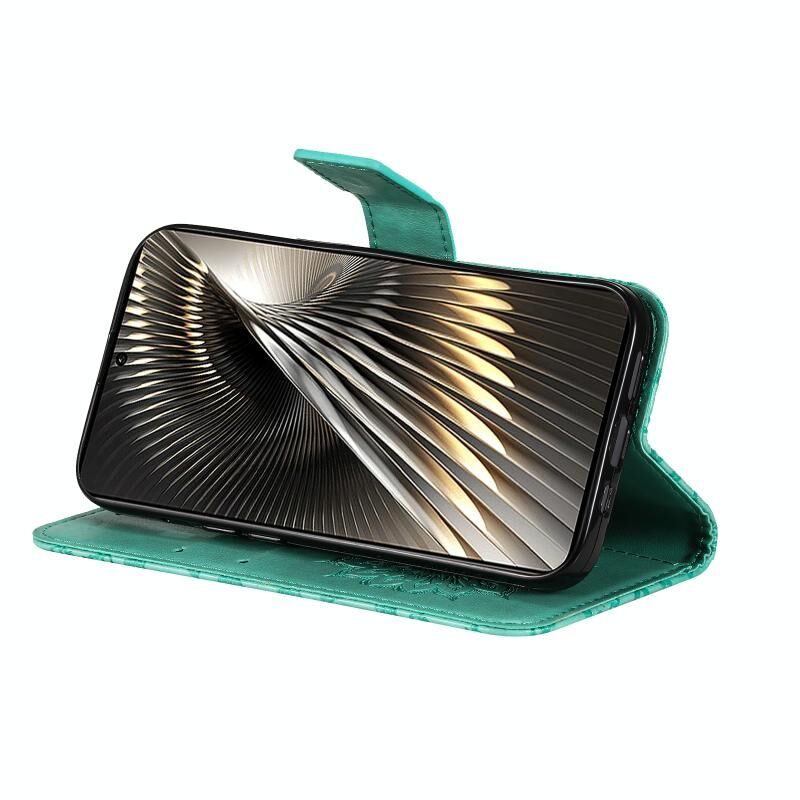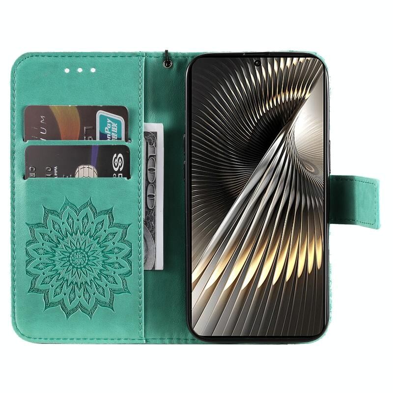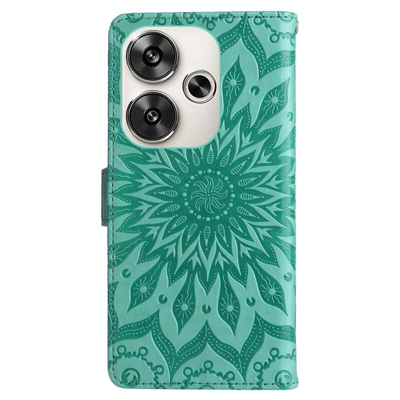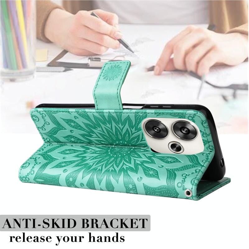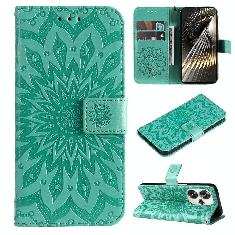 Για Xiaomi Poco F6 ανάγλυφο ηλιοτρόπιο μοτίβο Flip υπόθεση τηλεφώνου δέρμα (πράσινο)