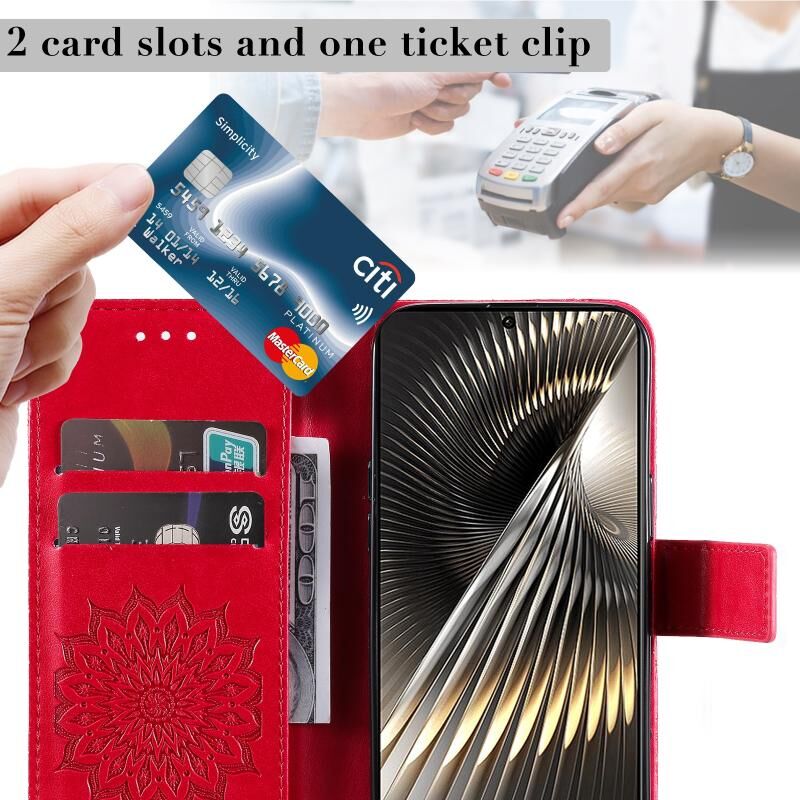 Για Xiaomi Poco F6 ανάγλυφο ηλιοτρόπιο μοτίβο Flip υπόθεση τηλεφώνου δέρμα (Κόκκινο)