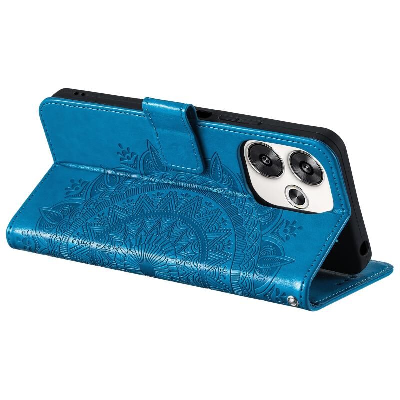 Θήκη τηλεφώνου δερμάτινη με ανάγλυφο σχέδιο Totem Flower για Xiaomi Poco F6 με κορδόνι (Μπλε)