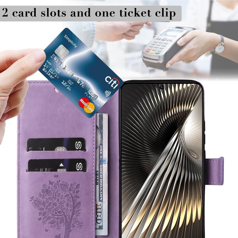 Για Xiaomi Poco F6 Tree & Cat ανάγλυφο μοτίβο Flip υπόθεση τηλεφώνου δέρμα (Light Purple)