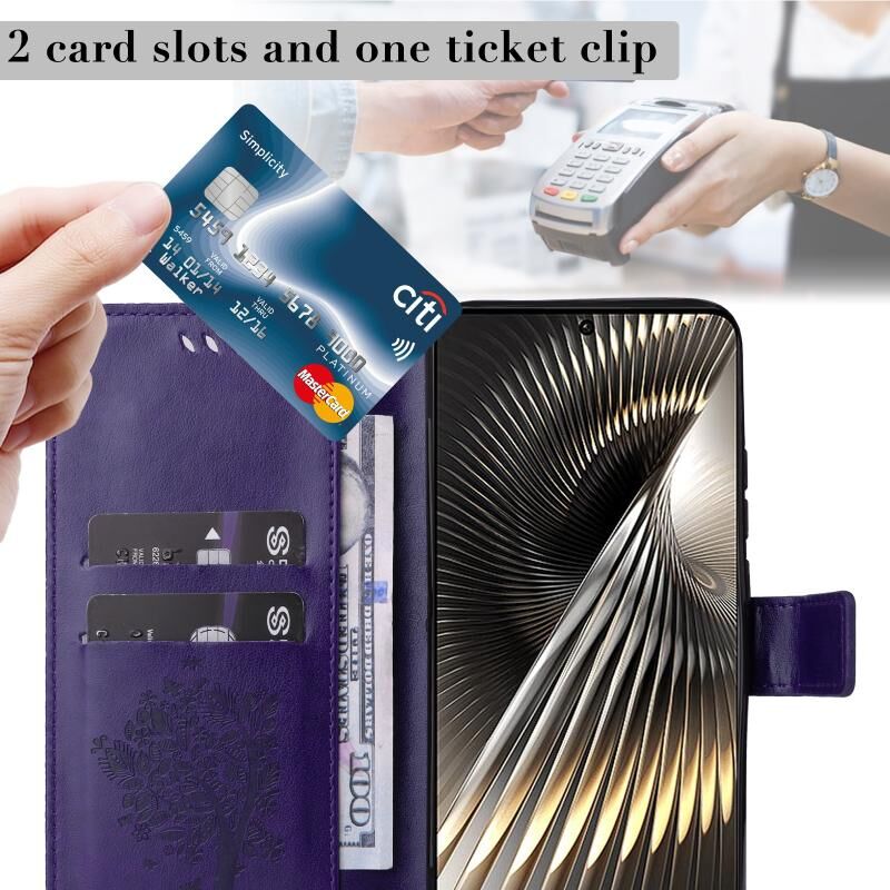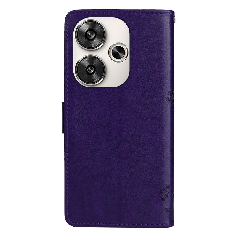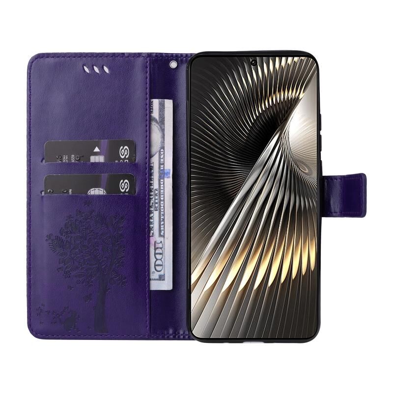 Για Xiaomi Poco F6 Tree & Cat ανάγλυφο μοτίβο Flip υπόθεση τηλεφώνου δέρμα (μωβ)
