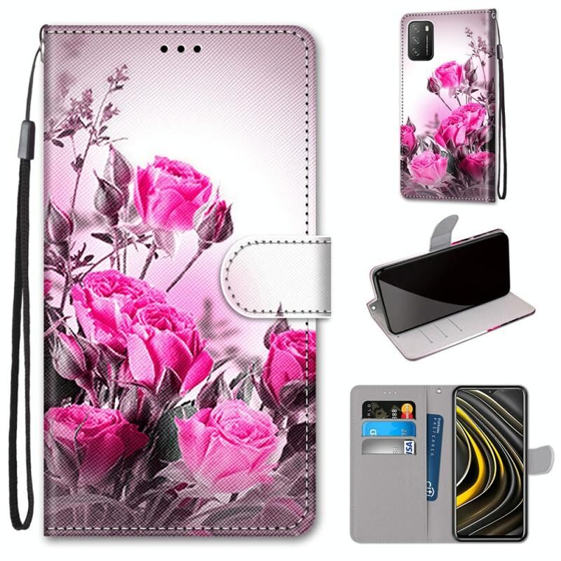 Θήκη για Xiaomi Poco M3 με πολύχρωμο σχέδιο, υφή σταυρού, οριζόντιο άνοιγμα, από δερματίνη PU με βάση στήριξης, θήκες για κάρτες, πορτοφόλι & λουρί (κόκκινο)