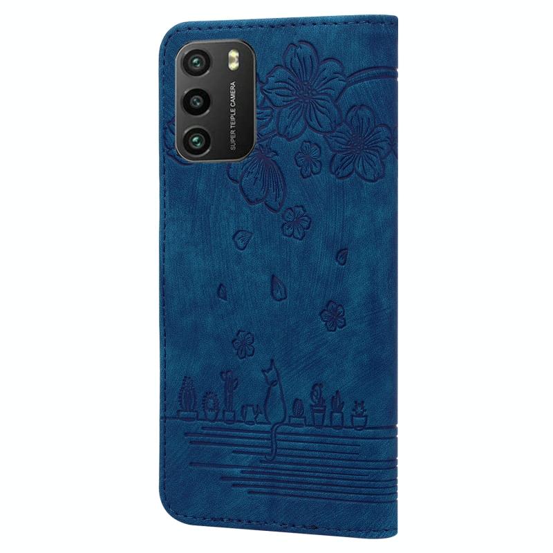 For Xiaomi Poco M3 / Redmi 9T Global Cartoon Sakura Cat Embossed Leather Phone Case(Royal Blue)