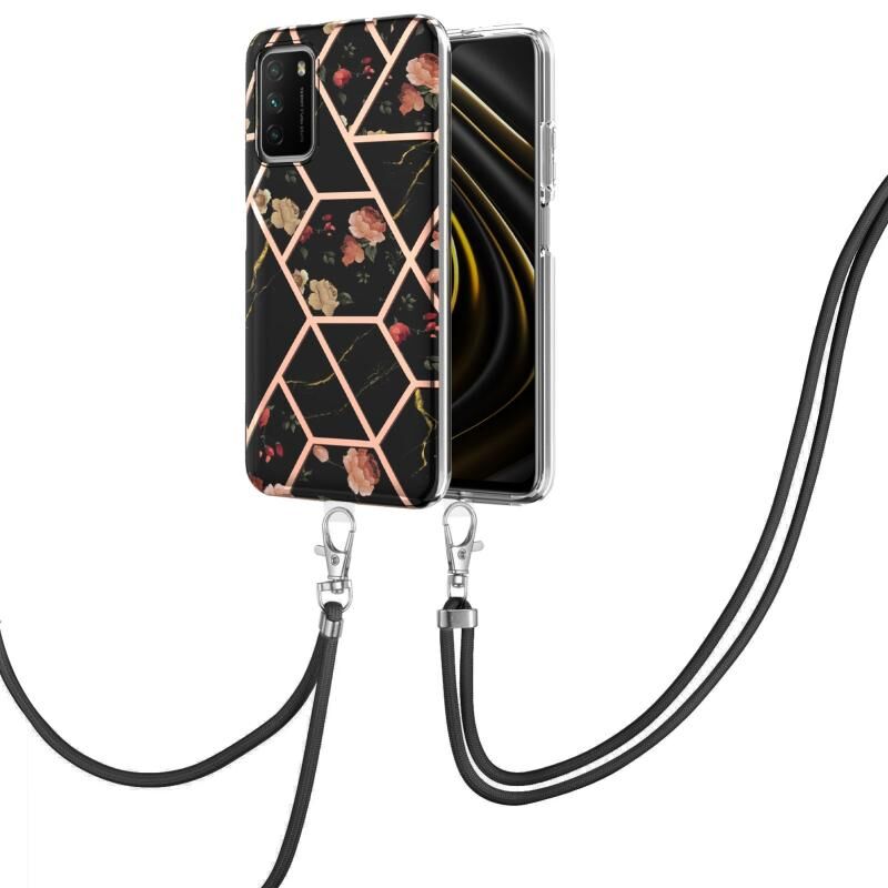 For Xiaomi Poco M3 / Redmi Note 9 4G Electroplating Splicing Marble Flower Pattern TPU Shockproof Case with Lanyard(Black Flower)