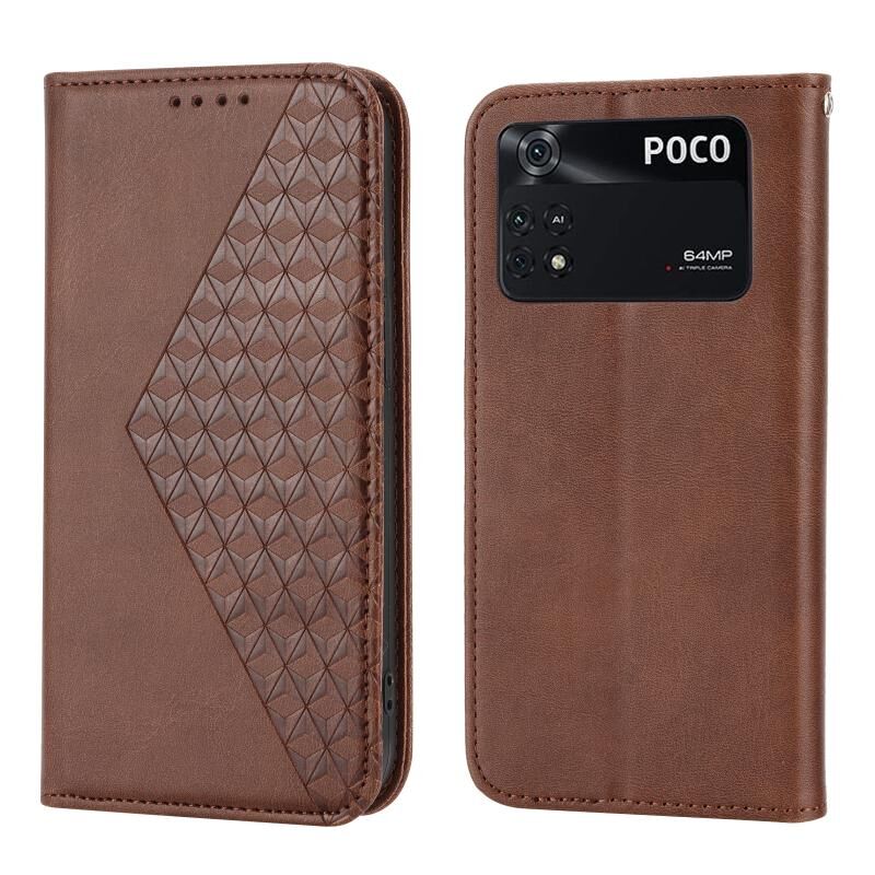 Θήκη τηλεφώνου από δέρμα με μαγνητικό κλείσιμο, υφή μοσχαρίσιου δέρματος σε κυβικό πλέγμα για Xiaomi Poco M4 Pro 4G Global (Καφέ)