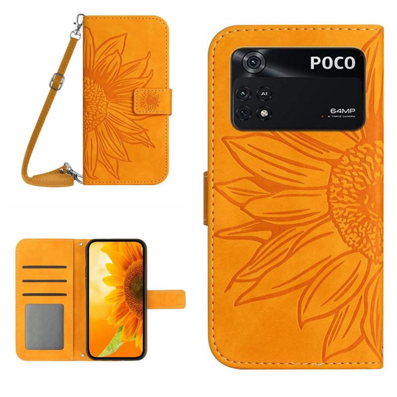 Θήκη τηλεφώνου από δέρμα με σχέδιο ηλιοτρόπιου και αίσθηση δέρματος για Xiaomi Poco M4 Pro 4G, με λουρί (Κρασί)