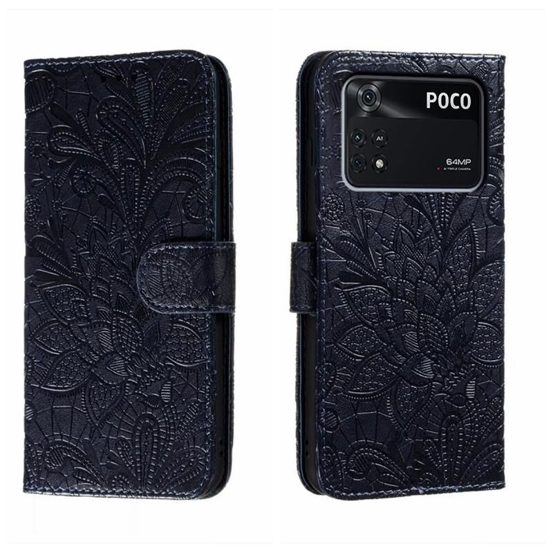 Για Xiaomi Poco M4 Pro Lace λουλούδι ανάγλυφο Flip υπόθεση τηλεφώνου δέρμα (σκούρο μπλε)