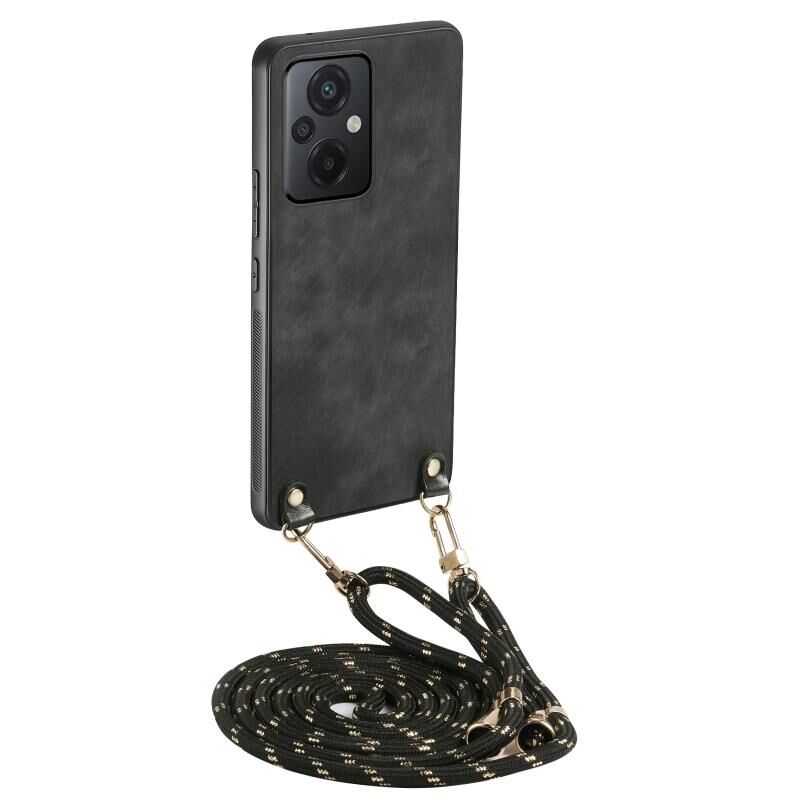 Για Xiaomi Poco M5 4G εκλεκτής ποιότητας δέρμα PC πίσω κάλυμμα τηλέφωνο υπόθεση με λουράκι σταυρού (Μαύρο)