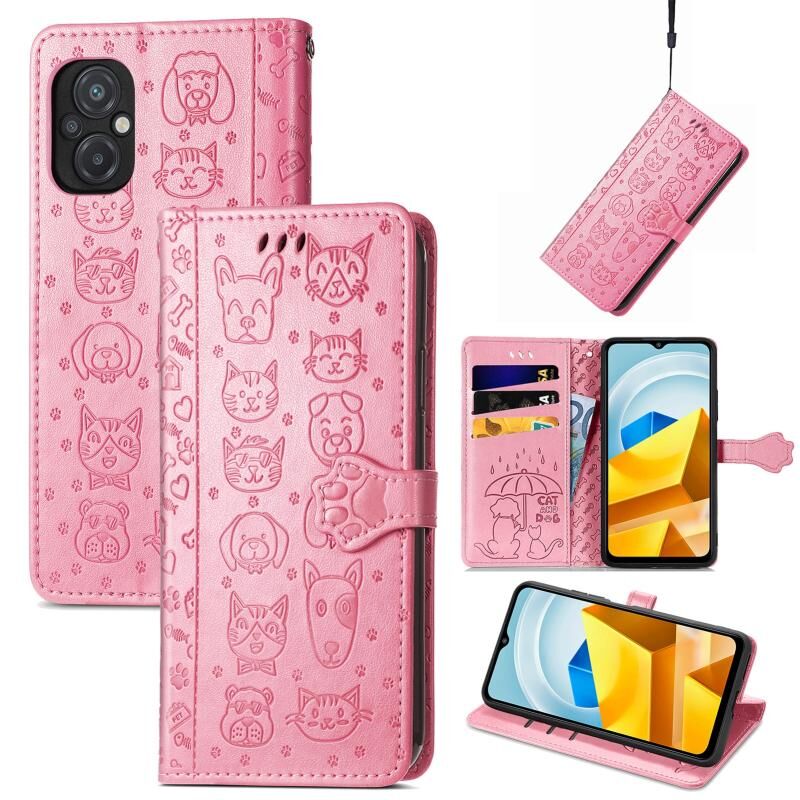Θήκη τηλεφώνου από δέρμα με ανάγλυφα σχέδια γάτας και σκύλου για Xiaomi Poco M5 (Μωβ)