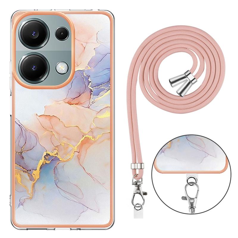 For Xiaomi Poco M6 Pro 4G Electroplating IMD TPU Phone Case with Lanyard(White Marble)