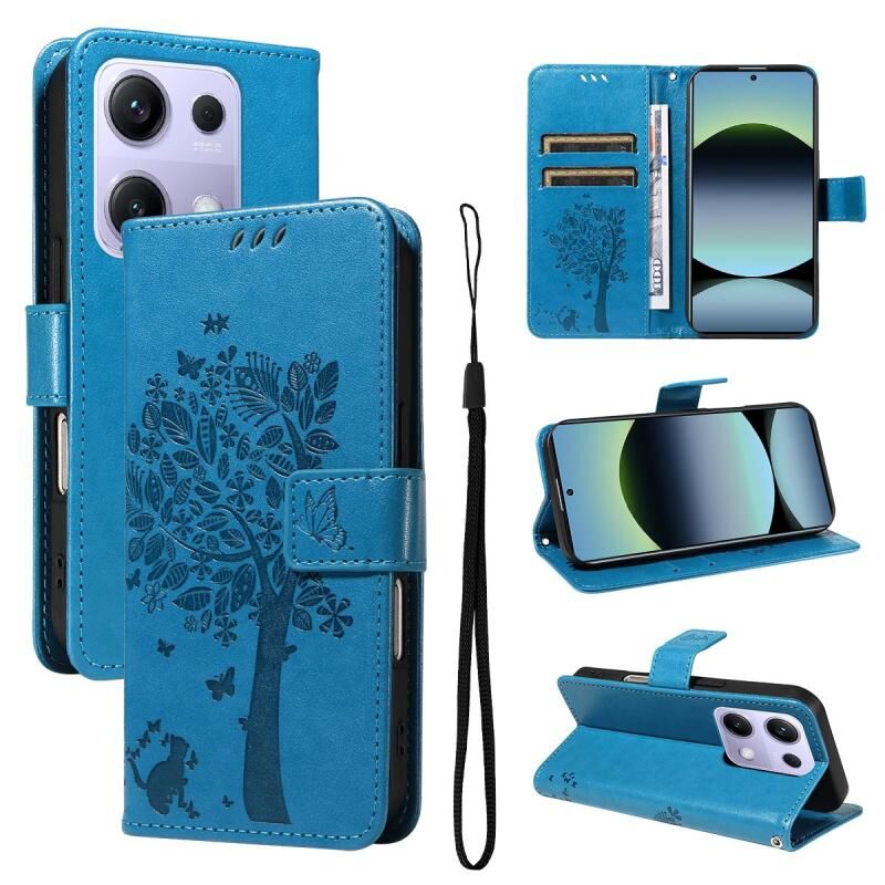 Θήκη τηλεφώνου από δέρμα με σχέδιο αναγλύφου δέντρου & γάτας για Xiaomi Poco M6 Pro 4G Global (Μπλε)