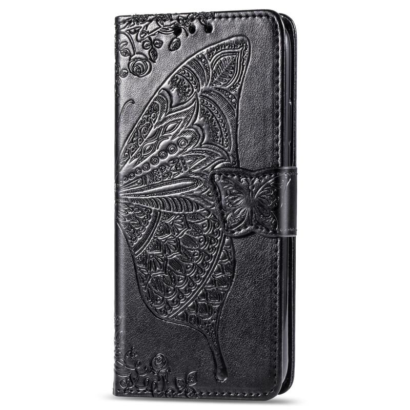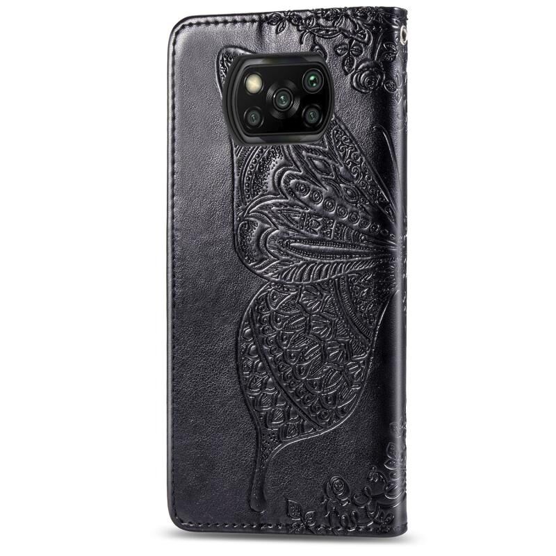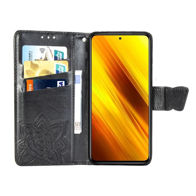 Θήκη δέρματος οριζόντιας αναδίπλωσης για Xiaomi Poco X3 NFC με ανάγλυφο σχέδιο πεταλούδας και λουλουδιών, με βάση / υποδοχή κάρτας / πορτοφόλι / κορδόνι (Μαύρο)