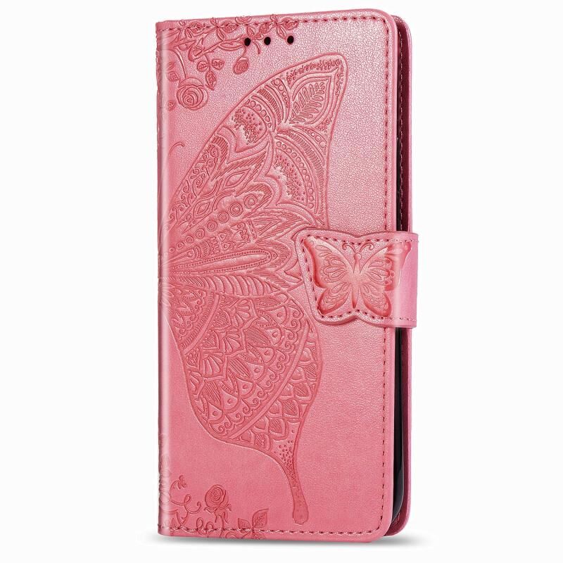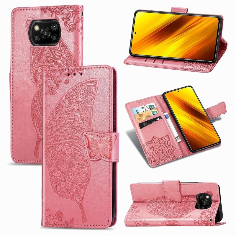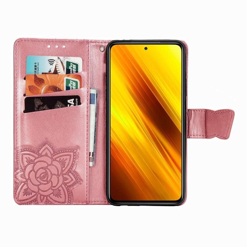 Θήκη δέρματος οριζόντιας αναδίπλωσης για Xiaomi Poco X3 NFC με ανάγλυφο σχέδιο πεταλούδας και λουλουδιών, με βάση / υποδοχή κάρτας / πορτοφόλι / κορδόνι (Μαύρο)