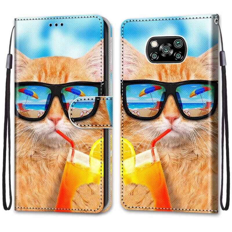 Θήκη για Xiaomi Poco X3 NFC με πολύχρωμο σχέδιο, υφή σταυρού, οριζόντια αναδίπλωση από δερματίνη PU με βάση στήριξης, θήκες για κάρτες, πορτοφόλι & κορδόνι (Γάτα που πίνει αναψυκτικό)