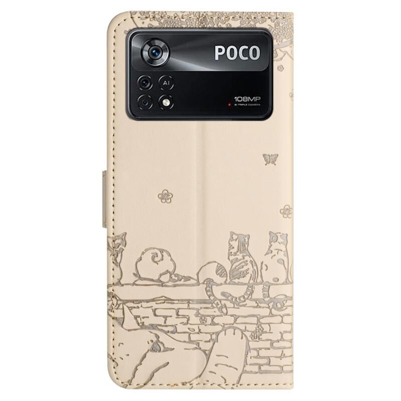 Θήκη τηλεφώνου δερμάτινη με ανάγλυφο σχέδιο γάτας για Xiaomi Poco X4 Pro 5G με κορδόνι (Μπεζ)