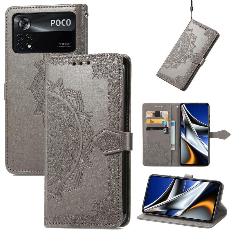 Για Xiaomi Poco X4 Pro 5G Mandala λουλούδι ανάγλυφο ανάγλυφο Flip δέρμα υπόθεση τηλεφώνου (γκρι)