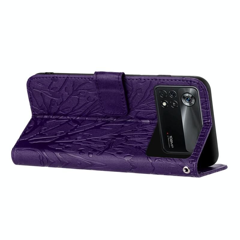 Θήκη δερμάτινη με ανάγλυφο σχέδιο δέντρων και πουλιών για Xiaomi Poco X4 Pro 5G (Μωβ)
