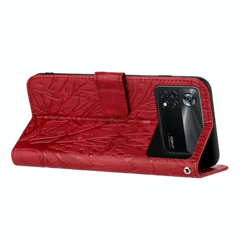 Θήκη δερμάτινη με ανάγλυφο σχέδιο δέντρων και πουλιών για Xiaomi Poco X4 Pro 5G (Κόκκινο)