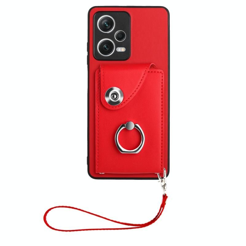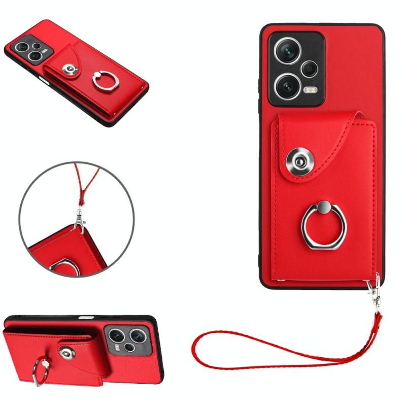 Για Xiaomi Poco X5 / Redmi Σημείωση 12 5G Παγκόσμια Οργανική κάρτα τσάντα δαχτυλίδι κάτοχος PU τηλέφωνο υπόθεση με κορδόνι (Κόκκινο)