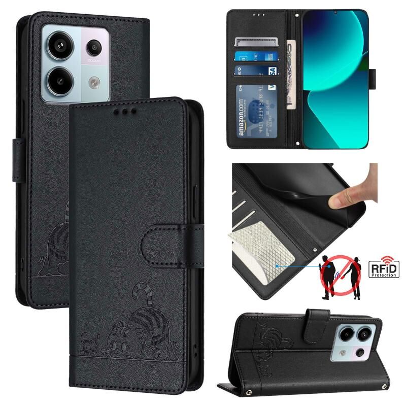 Για Xiaomi POCO X6 5G Global Θήκη PU με σχέδιο γάτας και λουρί καρπού (Μαύρο)