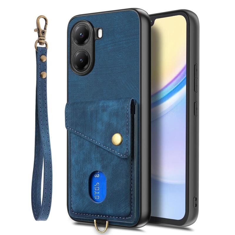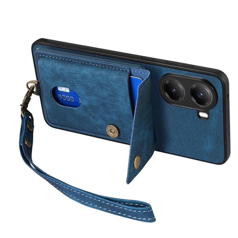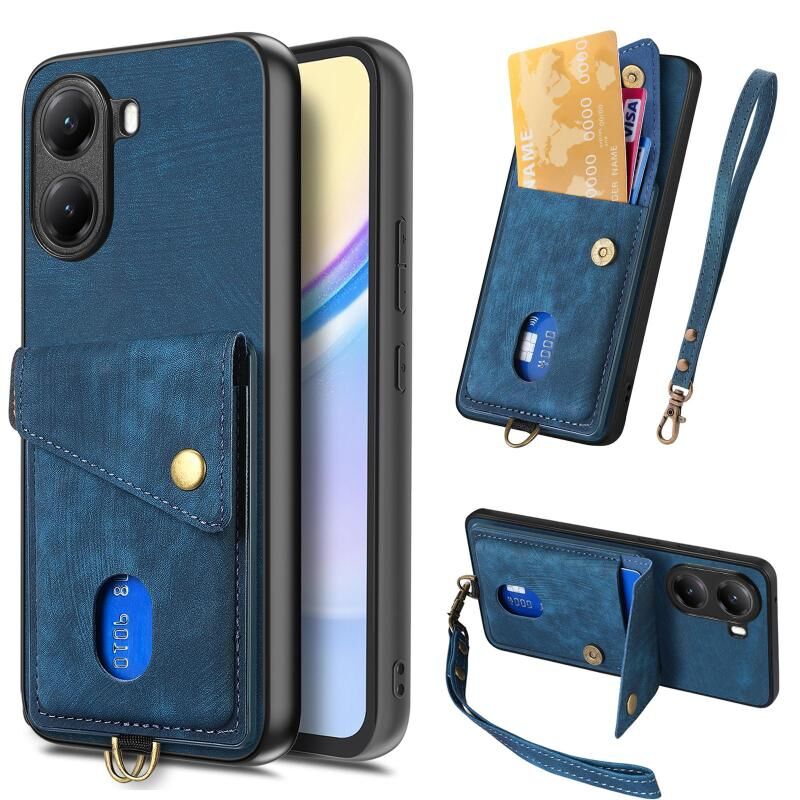 Θήκη τηλεφώνου από δέρμα με αναδιπλούμενο σχέδιο και κάρτες για Xiaomi Poco X7 Pro, σε ρετρό στυλ, με λουρί (Μπλε)
