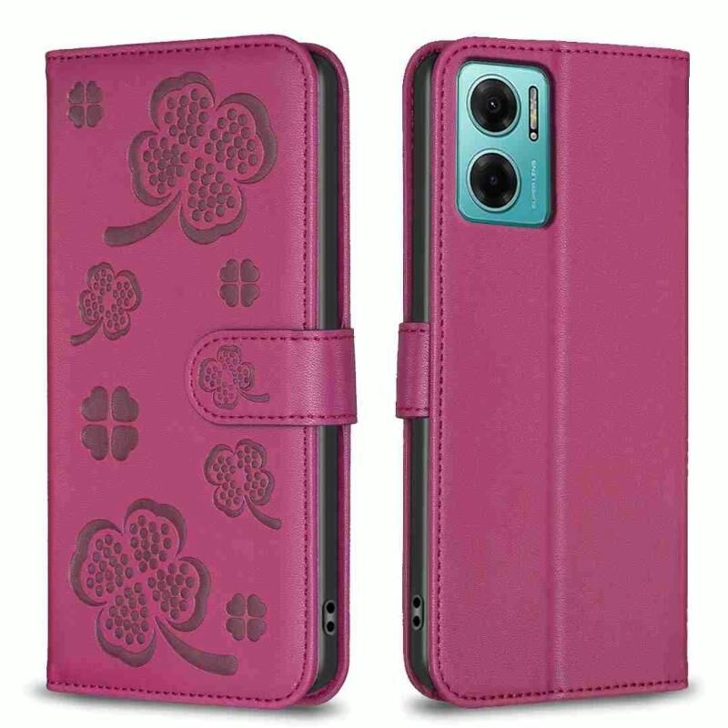 Για Xiaomi Redmi 10 5G / Note 11E τετράφυλλο ανάγλυφο δέρμα υπόθεση τηλεφώνου (Rose Red)