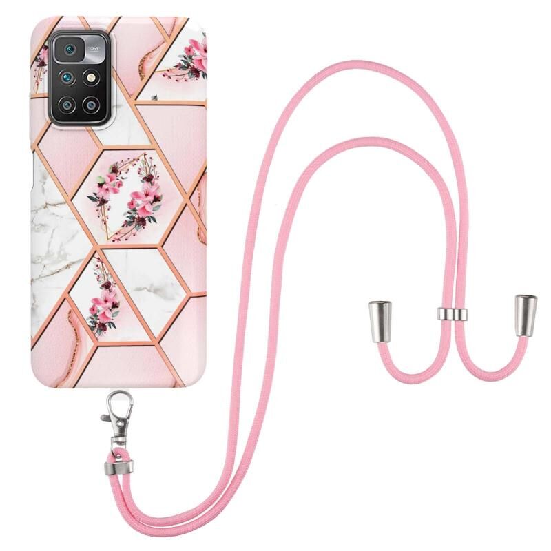 Θήκη τηλεφώνου TPU για Xiaomi Redmi 10 με ηλεκτρολυτική επιμετάλλωση, συνδυασμό μαρμάρου και λουλουδιών, με κορδόνι (Ροζ άνθος)