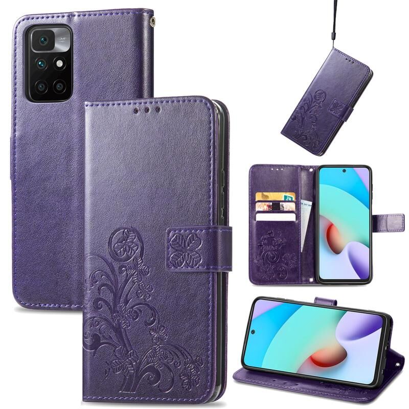 Για Xiaomi Redmi 10 Τέσσερα φύλλα κούμπωμα ανάγλυφο αγκράφα κινητό τηλέφωνο προστασία δερμάτινη θήκη με κορδόνι & υποδοχή κάρτας & πορτοφόλι & λειτουργία βραχίονα (μωβ)