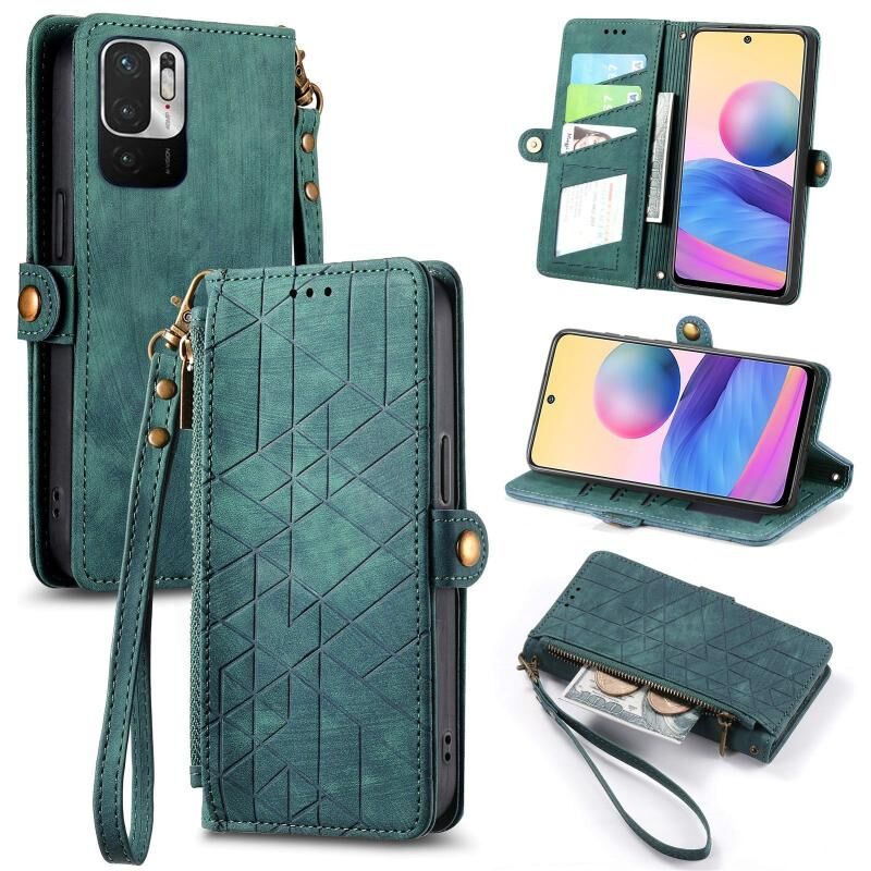 Για Xiaomi Redmi 10 γεωμετρική φερμουάρ πορτοφόλι πλευρά πόρπη δερμάτινη θήκη τηλεφώνου (πράσινο)