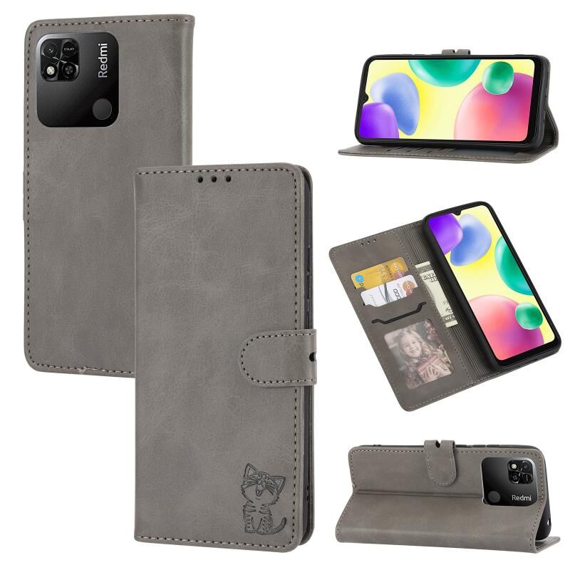 Θήκη τηλεφώνου δερμάτινη με ανάγλυφο σχέδιο χαρούμενης γάτας για Xiaomi Redmi 10A (Γκρι)