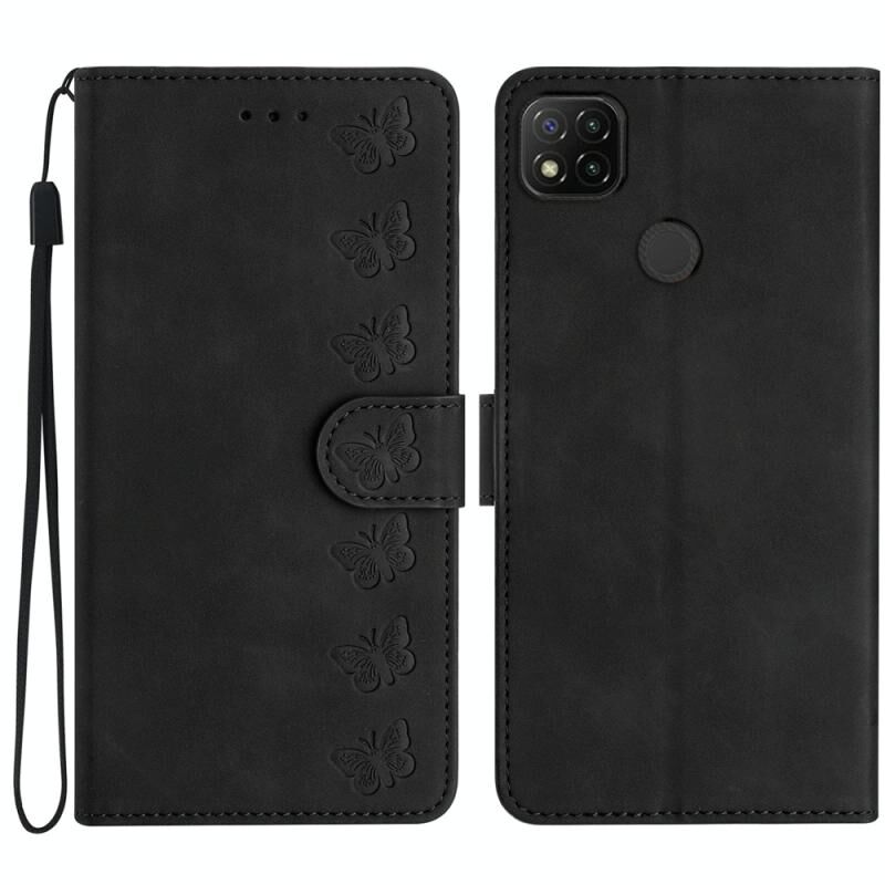 Για Xiaomi Redmi 10A Επτά πεταλούδες ανάγλυφη δερμάτινη θήκη τηλεφώνου (μαύρο)