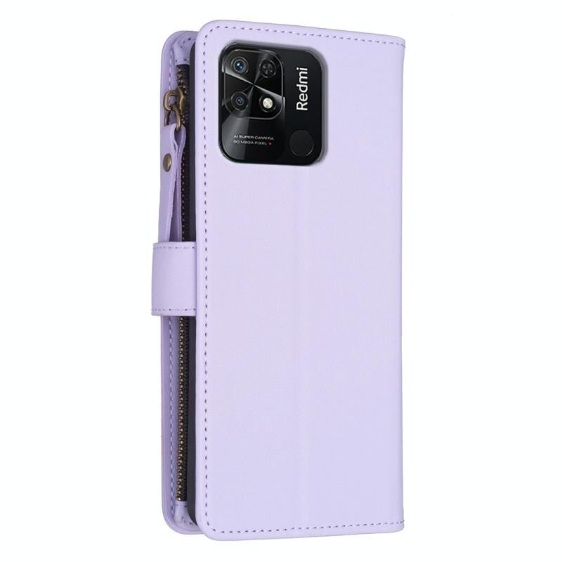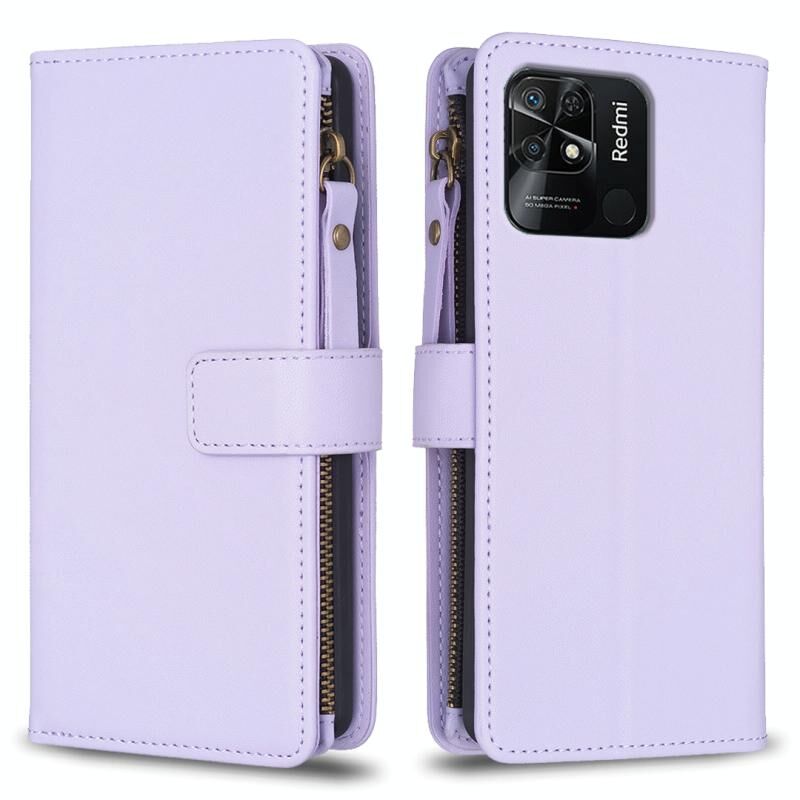 Για Xiaomi Redmi 10C 9 Card Slots φερμουάρ πορτοφόλι δέρμα Flip υπόθεση τηλεφώνου (Light Purple)