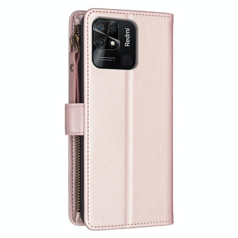 Για Xiaomi Redmi 10C 9 Card Slots φερμουάρ πορτοφόλι δέρμα Flip τηλέφωνο υπόθεση (Rose Gold)