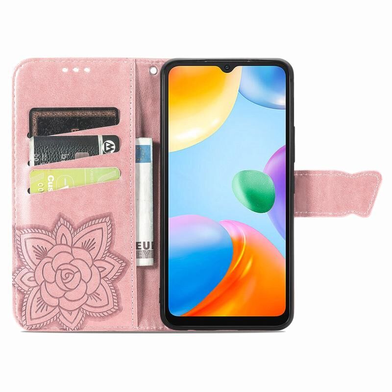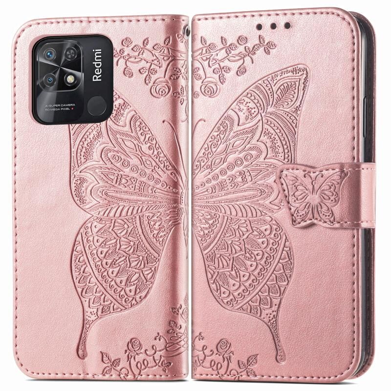 Θήκη τηλεφώνου δερμάτινη ανάγλυφη με σχέδιο πεταλούδας και λουλουδιών για Xiaomi Redmi 10C (Ροζ χρυσός)