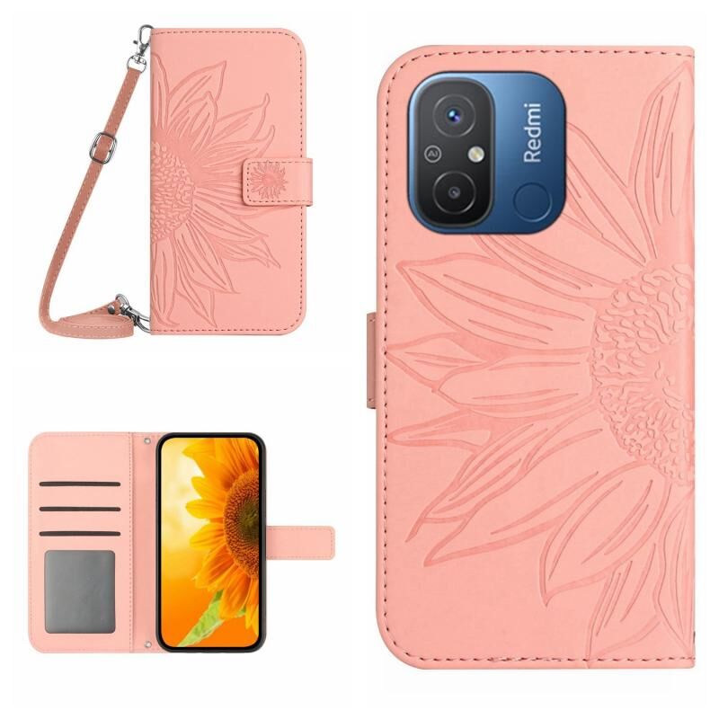 Για Xiaomi Redmi 11A 4G HT04 Skin Feel Sun Flower ανάγλυφο Flip δερμάτινη θήκη τηλεφώνου με κορδόνι (ροζ)