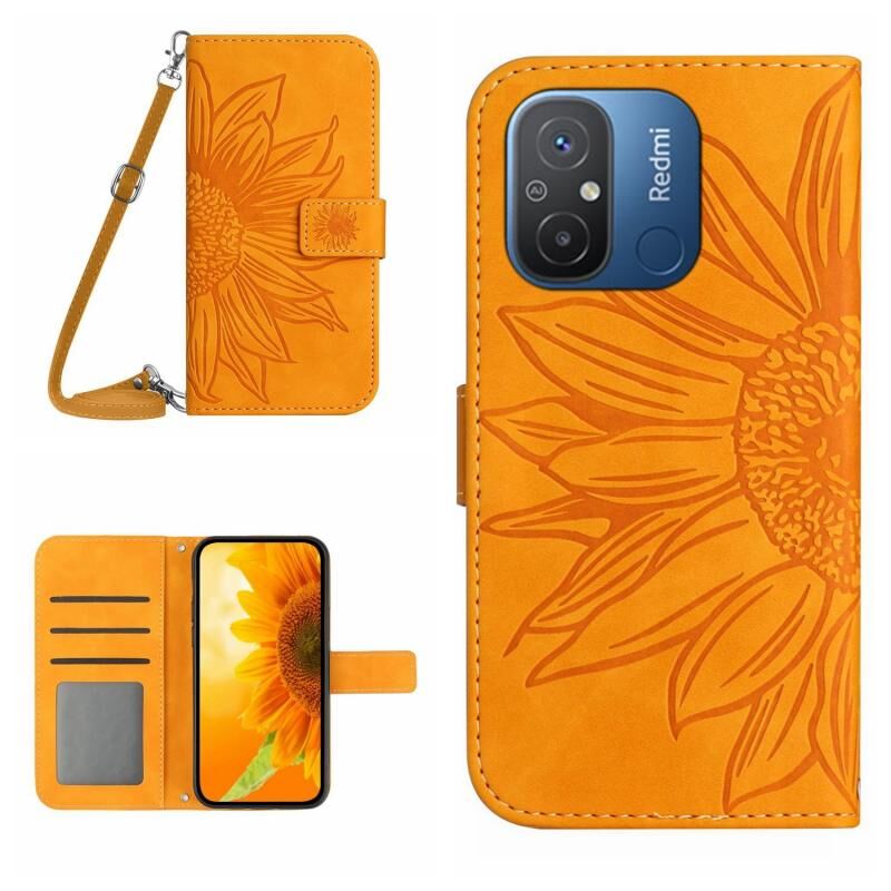 Για Xiaomi Redmi 11A 4G HT04 Skin Feel Sun Flower ανάγλυφο Flip δερμάτινη θήκη τηλεφώνου με κορδόνι (κίτρινο)