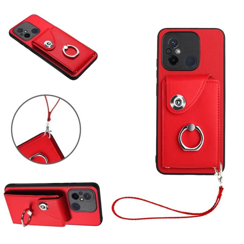 Για Xiaomi Redmi 12C/11A Οργανική κάρτα τσάντα δαχτυλίδι κάτοχος PU τηλέφωνο υπόθεση με κορδόνι (κόκκινο)