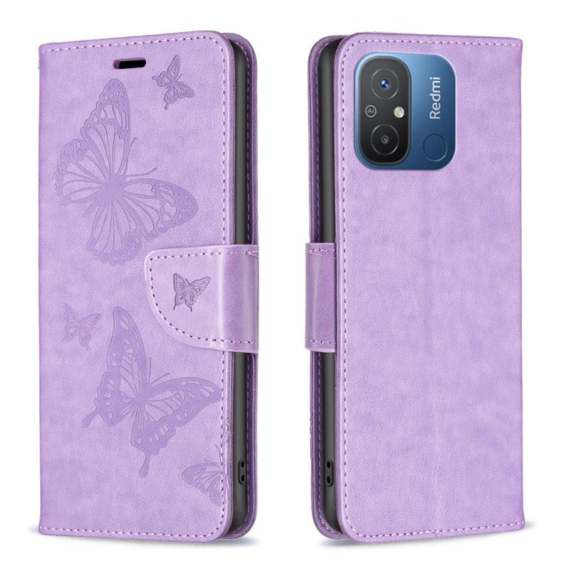 Θήκη τηλεφώνου δερμάτινη με ανάγλυφο σχέδιο δύο πεταλούδων για Xiaomi Redmi 12C (Μωβ)
