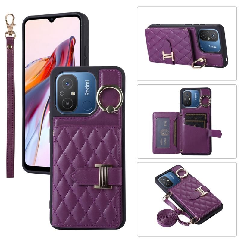 Για Xiaomi Redmi 12C Οριζόντια κάρτα τσάντα δαχτυλίδι τσάντα κάτοχος υπόθεση τηλεφώνου με διπλή κορδόνι (Σκούρο μωβ)