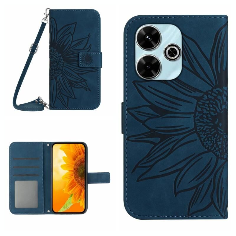 Θήκη τηλεφώνου από δέρμα με ανάγλυφο ηλιοτρόπιο και αίσθηση δέρματος για Xiaomi Redmi 13 4G Global / 5G Global με κορδόνι (Inky Blue)