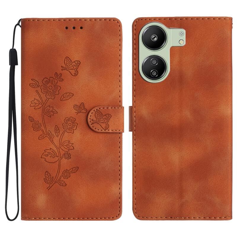 Για Xiaomi Redmi 13C 4G λουλούδι πεταλούδα ανάγλυφο μοτίβο δερμάτινη θήκη τηλεφώνου (καφέ)