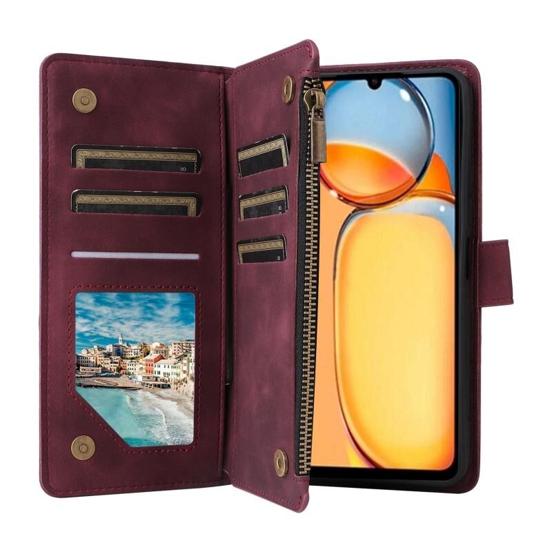 Για Xiaomi Redmi 13C 4G Παγκόσμια πολυλειτουργική παγωμένο φερμουάρ πορτοφόλι δερμάτινη θήκη τηλεφώνου (Κρασοκόκκινο)