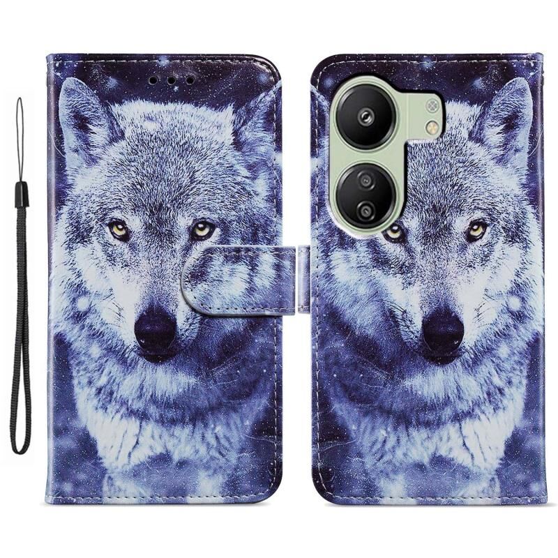 Θήκη τηλεφώνου δερμάτινη, οριζόντια αναδιπλούμενη με ζωγραφισμένο σχέδιο για Xiaomi Redmi 13C 4G (Λευκός Λύκος)