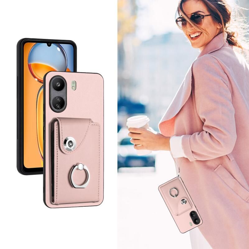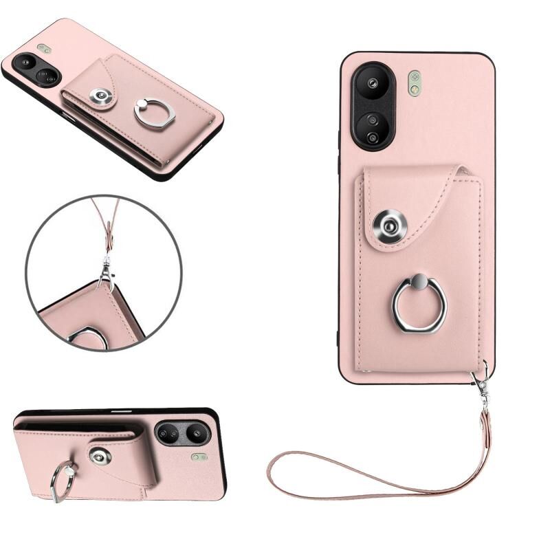 Για Xiaomi Redmi 13C 4G / Poco C65 Οργανική κάρτα τσάντα τσάντα δαχτυλίδι κάτοχος PU υπόθεση τηλεφώνου με κορδόνι (ρόζ)