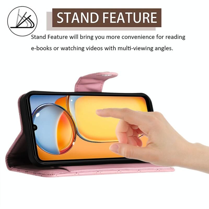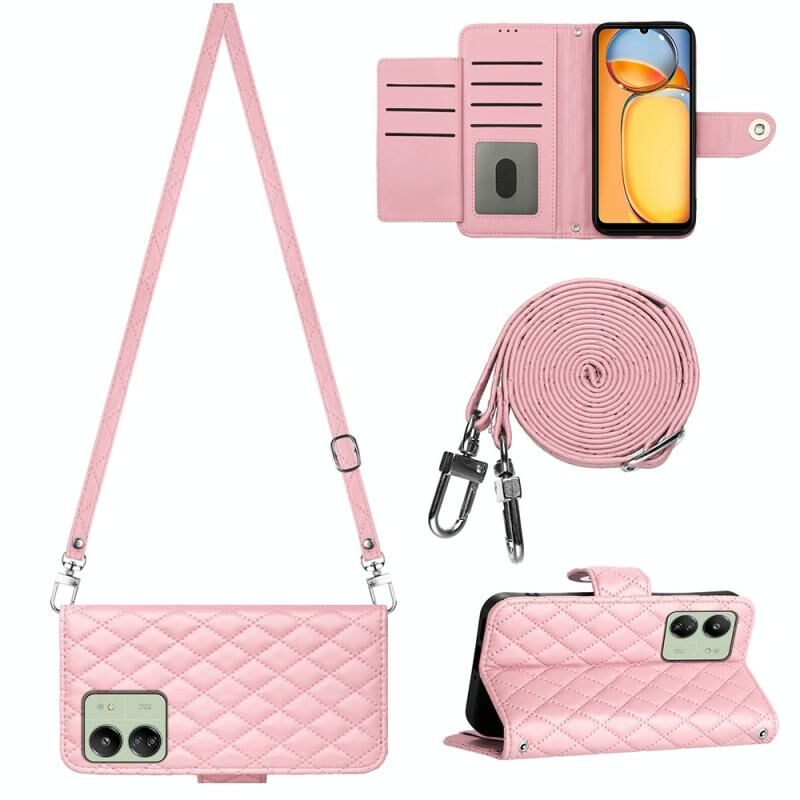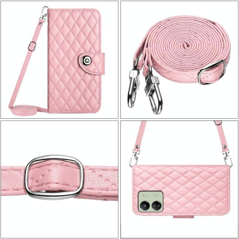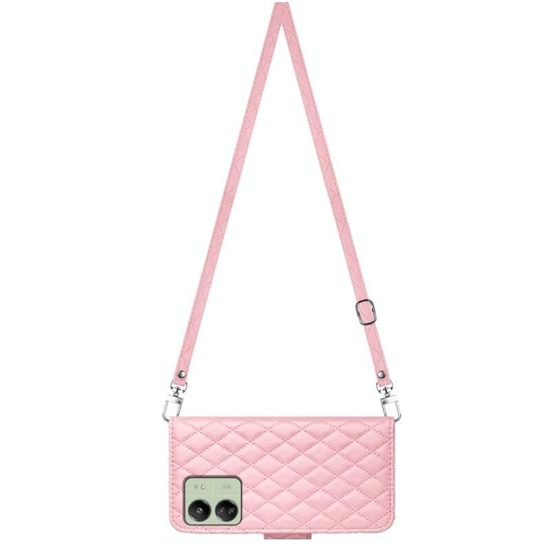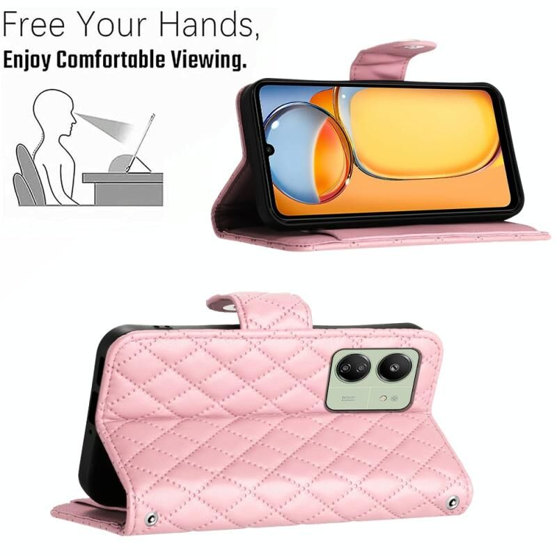 Για Xiaomi Redmi 13C 4G Rhombic υφή Flip δέρμα τηλέφωνο υπόθεση με μακρύ κορδόνι (ροζ)