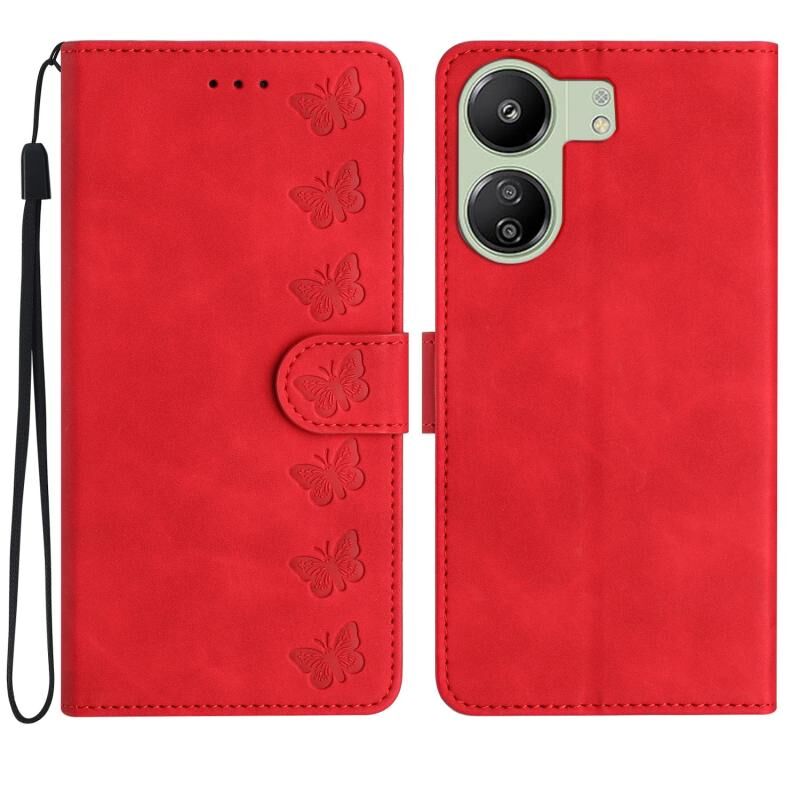 Για Xiaomi Redmi 13C 4G Επτά πεταλούδες ανάγλυφη δερμάτινη θήκη τηλεφώνου (Κόκκινο)