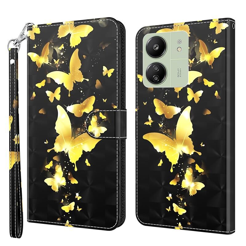 Θήκη τηλεφώνου από δέρμα με σχέδιο 3D ζωγραφικής για Xiaomi Redmi 13C 5G / 4G (Χρυσή Πεταλούδα)