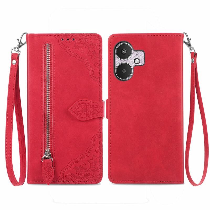 Για Xiaomi Redmi 13C 5G ανάγλυφο λουλούδι φερμουάρ δερμάτινη θήκη τηλεφώνου (κόκκινο)