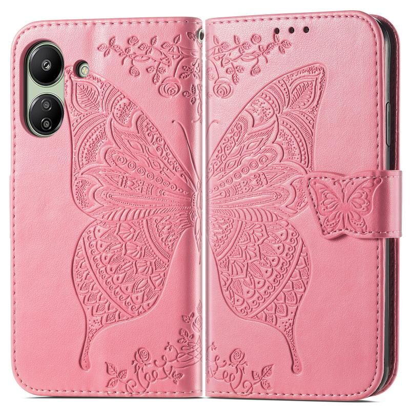 Θήκη τηλεφώνου δερμάτινη ανάγλυφη με σχέδιο πεταλούδας και λουλουδιών για Xiaomi Redmi 13C (Χρυσό Ροζ)